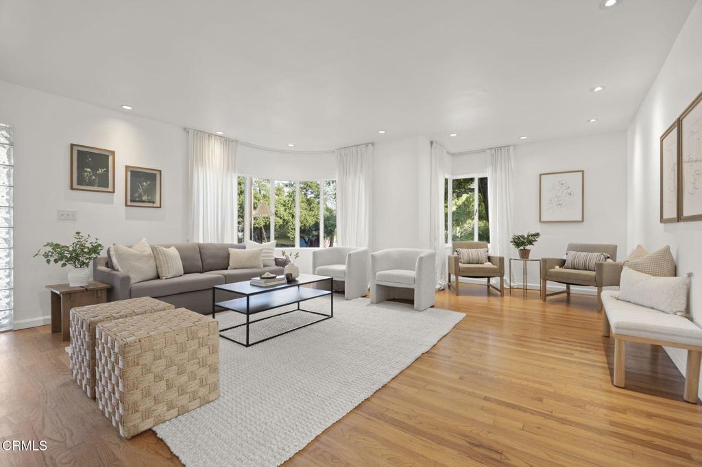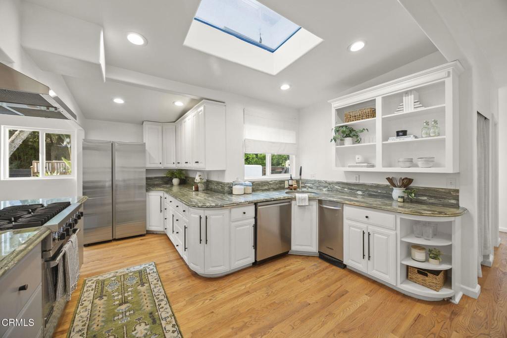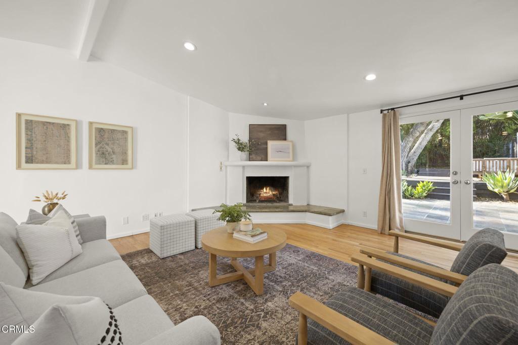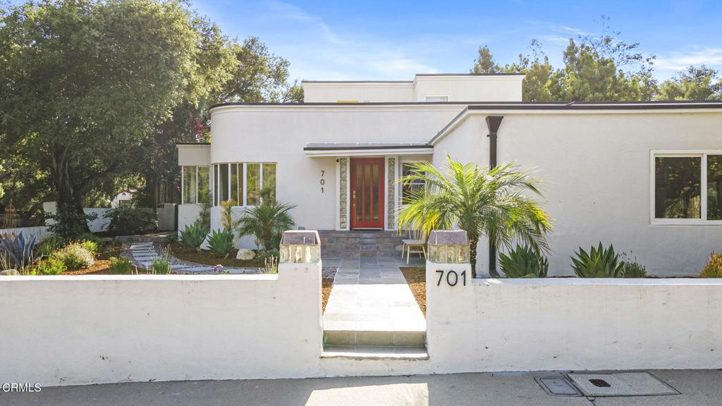 With an enviable location at the upper end of Canada St just blocks from downtown Ojai, this one of a kind 4 bedroom 4 bath Art Deco home features curved lines with a Mid Century feel. Upon entering you are greeted with ample windows allowing natural light to filter in. A gourmet kitchen opens up to the generous living room and dining room area equipped with a cozy fireplace and french doors leading out to the spacious backyard. Upstairs you will find a separate guest wing with its own private rooftop patio to enjoy the mountain views. Situated on .38 acres with decks for lounging, fruit trees, a fountain and mature landscaping. Additional features include a detached 2 car garage and an outdoor BBQ area. A true retreat in the heart of Ojai!