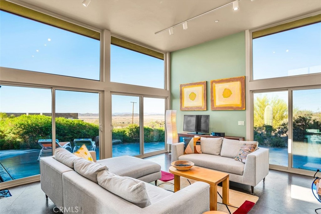 Villa Bajada—A Timeless Architectural Retreat in South Joshua Tree. Perched high near the Joshua Tree National Park boundary, on two contiguous parcels totaling 4.23 acres. Live with nature in this superb mid-century style modern gem while creating your personal studio for art, music, meditation, and entertainment. The main house is a 2007 built 1181 square foot 2-bedroom, 1 bath home with kitchen, dining room, living room, garage and features paid solar panels to reduce utility costs. Nearby the home, an unfinished 1108 square foot building flex space / art or yoga studio, featuring central HVAC, bathroom, another room and garage, plus in-ground pool—an opportunity to complete to taste with the original contractor still available and permit active. Surrounding the home, multiple patios and lush native landscaping create outdoor living spaces including a spa for moonlit dips and stargazing. This unique pied-à -terre makes a fantastic vacation getaway or a full-time residence or income / rental property. Rarely does a property of this vision come available. Villa Bajada is more than a home—it’s a living piece of art. Come experience this rare desert refuge now.