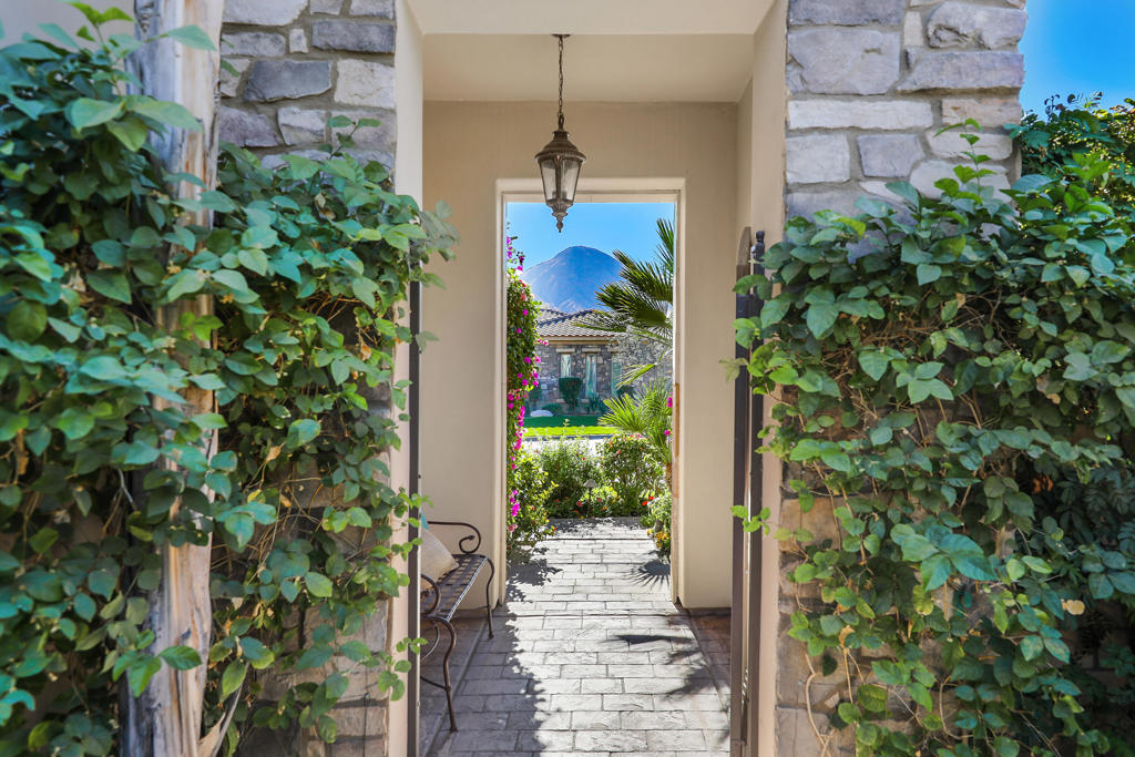 Gorgeous Tuscany inspired home built in 2005 on prime corner lot in fabulous, gated community of Montelena in the heart of Indian Wells. Beautiful home boasts 2991 square feet, high ceilings, neutral tiled floors, plantation shutters, 3 Bedrooms, 3 ensuite Baths, Powder bath, spacious formal and informal Dining room, plus Home Office. Elegant gated and pavered front Courtyard with impressive Rotunda entry. Stunning open Great Room awaits with granite fireplace and mirrored wet bar with glass shelves and granite countertops. Outstanding Gourmet Kitchen adjoins featuring big island with bar seating, granite countertops, full stone backsplash and stove hood, high-end stainless appliances includes new dishwasher, wine cooler, and walk-in pantry. Home office and Primary Bedroom have new luxury vinyl wood floors which adds such warmth to the home. Large Primary Bath has travertine countertops, dual sinks plus large vanity area, soak tub, big shower, and huge walk-in custom closet. Guest Bedrooms are carpeted and feature walk-in closets. The very private and lovely landscaped backyard has a large, covered patio highlighting the glistening pool/ spa and water features. Enjoy this remarkable home with special benefits and a private walkway to the Tommy Bahamas Miramonte hotel next door.