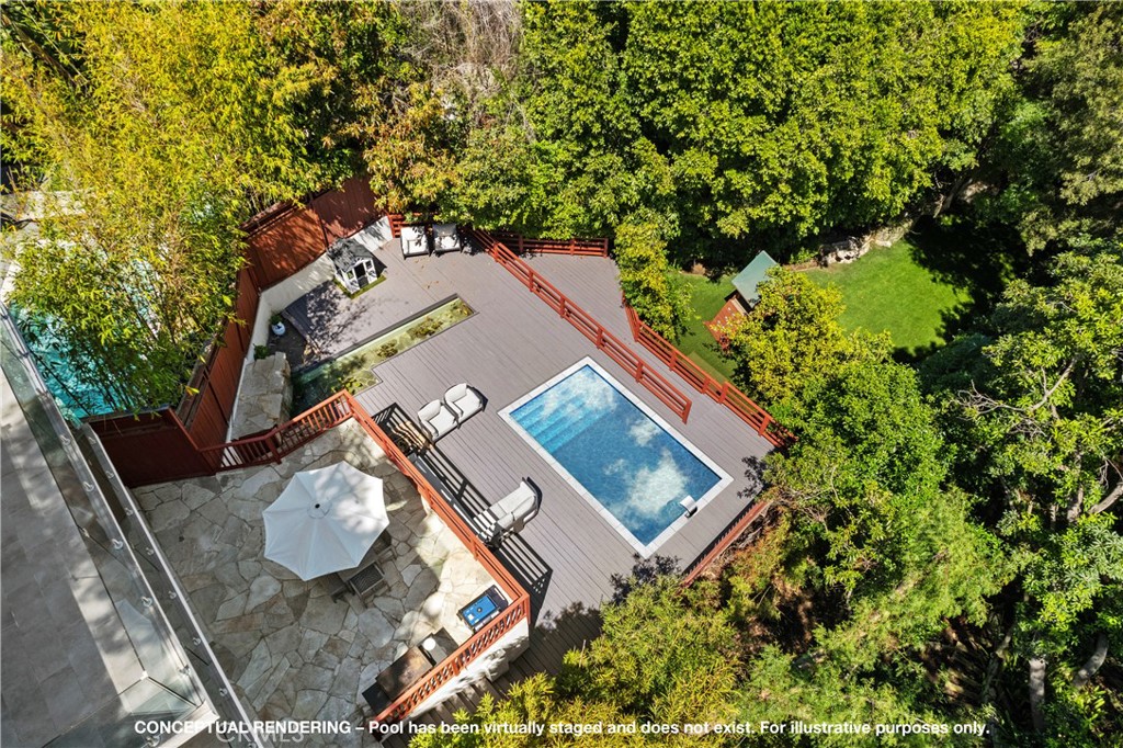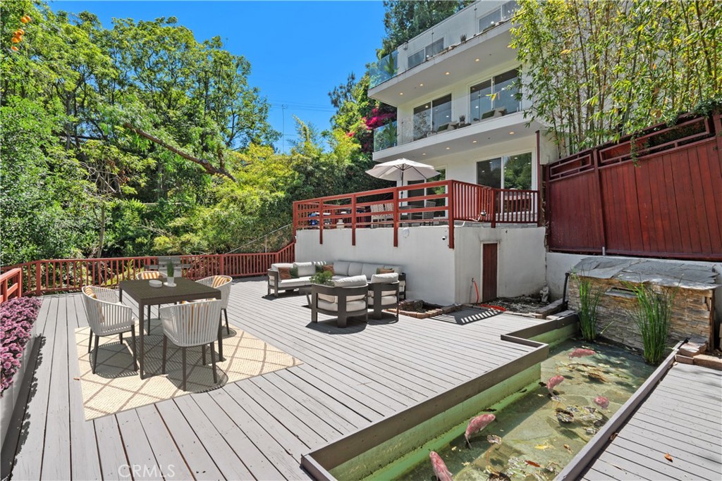 Tucked into the hills on iconic Celebrity Row, this architectural retreat delivers a rare combination of privacy, modern design, and immersive treetop views—just minutes from the Sunset Strip. With floor-to-ceiling glass throughout, the home offers seamless indoor-outdoor living and awe-inspiring natural light across nearly 3,100 sqft. Multiple expansive decks create a spectacular setting for entertaining, from intimate dinners to large-scale events under the stars. The oversized primary suite is a true sanctuary with its own private balcony, spa-style bath, and custom walk-in closet, while flexible living areas—including a glass-wrapped living room, media-ready family room, and serene library nook—accommodate both relaxation and creativity. A flat backyard with turf lawn and koi pond offers low-maintenance beauty and daily tranquility. Recent upgrades include wide-plank oak floors, smart home features, new HVAC, elastomeric roof coating, and an 8-camera security system. With off-street parking for five and direct access to Runyon Canyon’s hiking trails, this one-of-a-kind home offers effortless elegance in one of L.A.’s most desirable locations. A must-see for buyers seeking peace, style, and proximity to the pulse of the city.