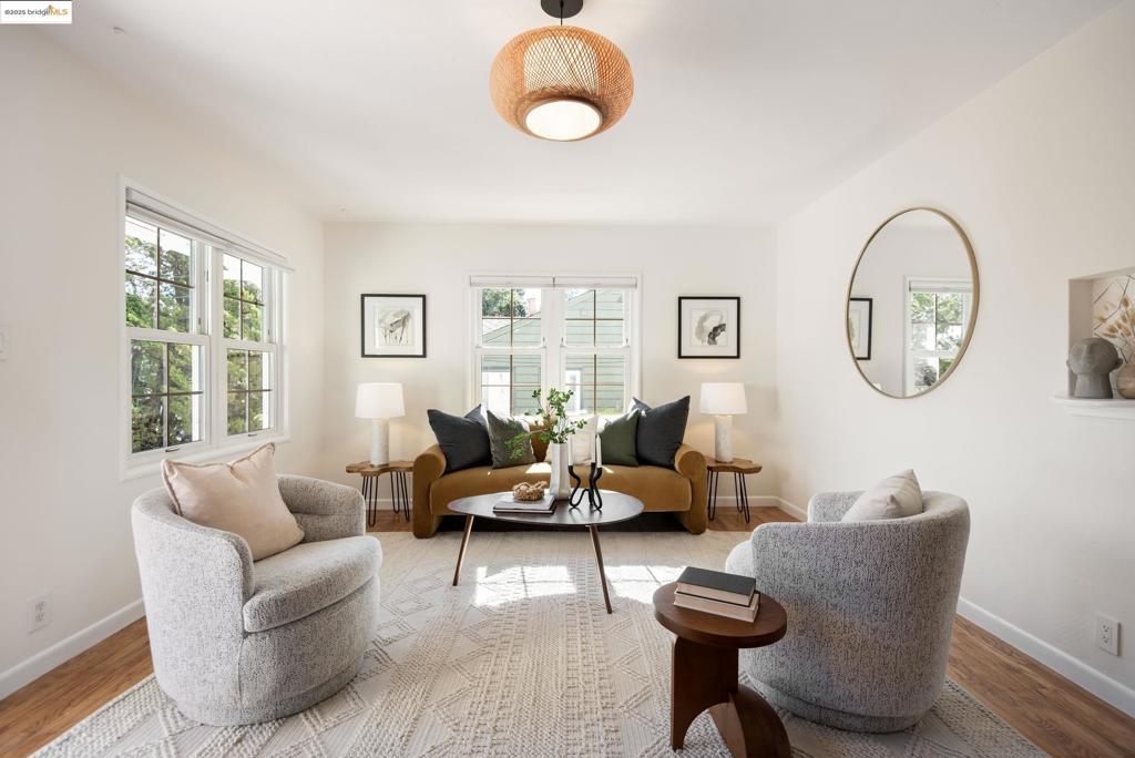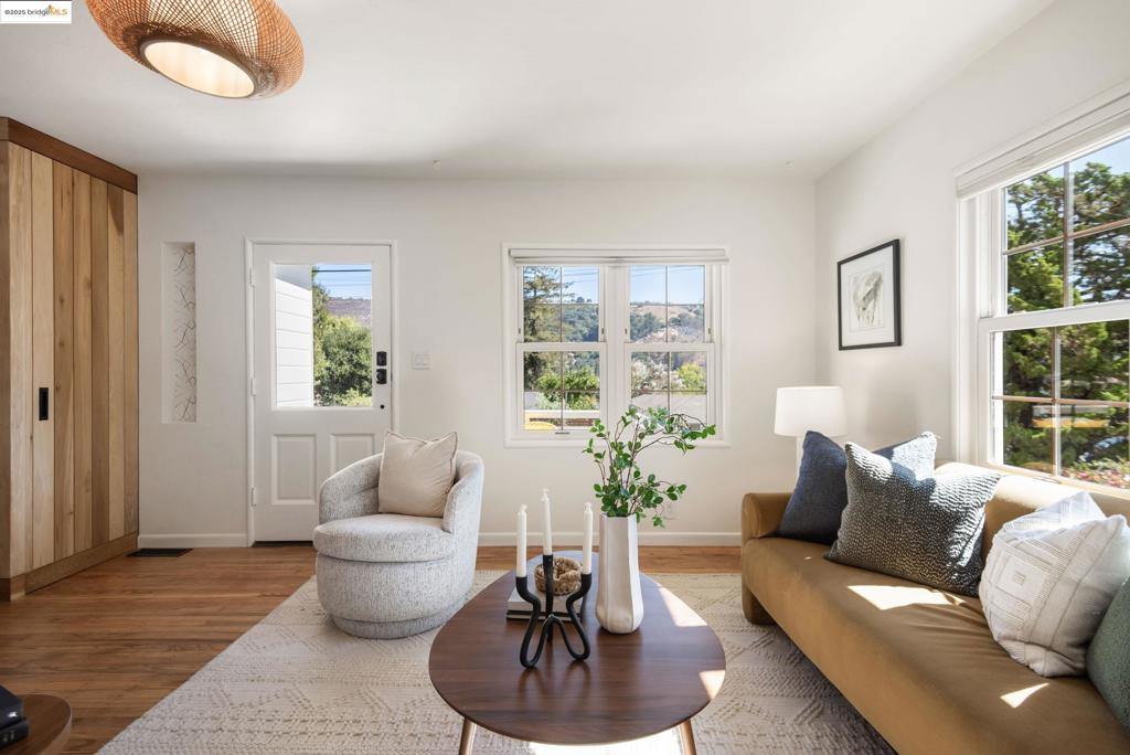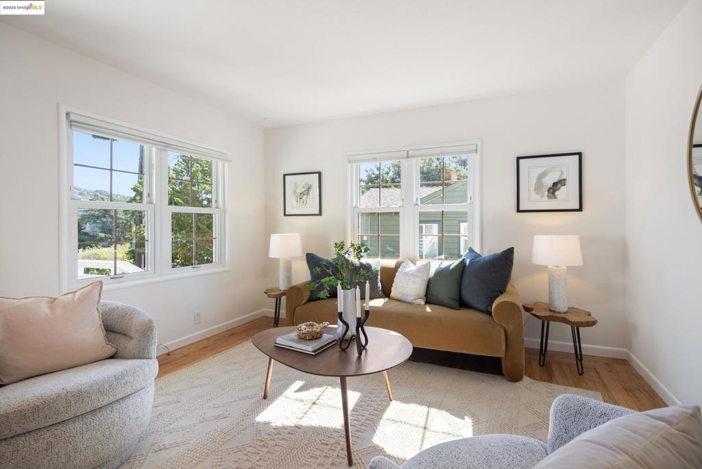 Looking for your own little slice of heaven? 7733 Sterling Drive is a beautifully updated 4 bed, 1.5 bath 1940s bungalow that blends charm with custom updates. Home boasts refinished hardwood floors, freshly painted exterior and interiors, custom built in closets, and recently remodeled bathrooms (2023 & 2025). Kitchen is designed with modern touches: bespoke cabinetry, a separate pantry, quartz & butcher block countertops, marmoleum flooring, Plank hardware, new LG 5-burner gas stove, dishwasher (2025), and GE refrigerator. Dual pane windows bring in cheer and natural light. A heat pump furnace and air conditioning (2021) were added for comfort and energy efficiency. Electrical upgrades include a 200 amp panel (2020), School-house and Article light fixtures. The outdoors is just as inviting, with apricot and plum trees, a covered deck for seating or gatherings, and a front garden space with views of the Oakland Hills. Detached garage and long driveway make parking convenient. Close to parks, shops, schools, & commuter routes.