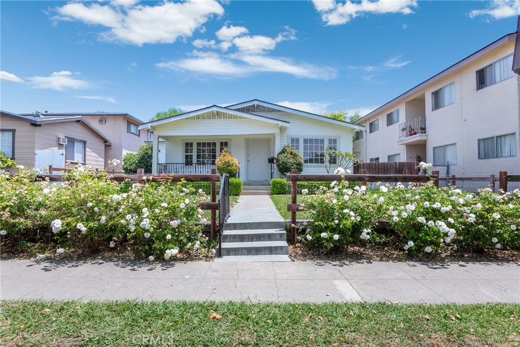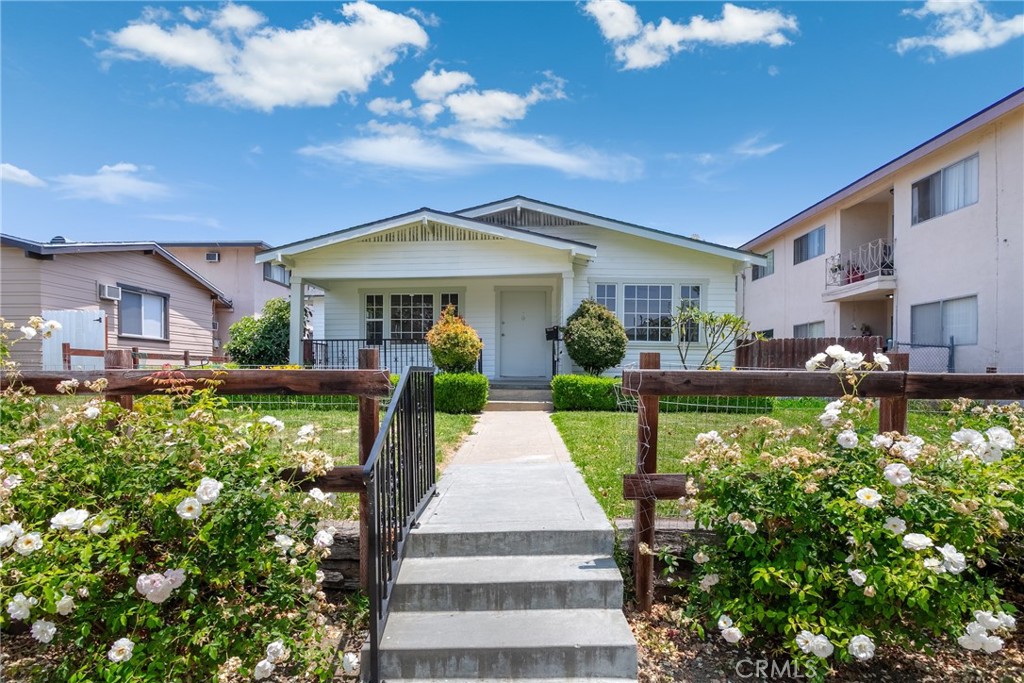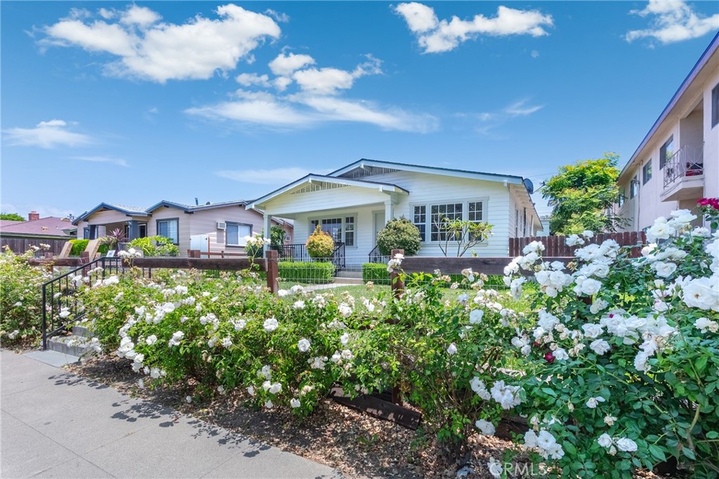 This Craftsman-style home sits in the heart of Uptown Whittier—just minutes from local colleges, shops, cafes, parks, and farmers’ market. The white rose-lined front yard, classic picket fence, and elevated lawn create a timeless first impression, while the spacious covered porch offers a cozy place to relax and enjoy the neighborhood’s charm. The living room features laminate flooring, recessed lighting, and large windows that bring in abundant natural light. It flows into a tiled dining area with backyard views and plenty of space for gatherings. The kitchen offers tiled countertops, ample cabinetry, and convenient access to the laundry area. All three bedrooms include wood flooring, ceiling fans, and built-in closets. The full bathroom features a tiled tub/shower combo. Recent updates include fresh interior paint, large window casings, an upgraded A/C system, newer water heater, and sprinkler systems. The backyard is ideal for outdoor living, with a pergola-covered patio, mature trees, and open space for gardening, recreation, or future landscaping. A detached rear structure offers additional storage or creative use. Rear alley access and an extra parking spot beside the garage provide added convenience. Zoned R3 (buyer to verify), the lot offers excellent potential for an ADU, additional units, or long-term investment. Combining original charm, thoughtful upgrades, and future possibilities, this home is a rare opportunity in one of Whittier’s most desirable neighborhoods.