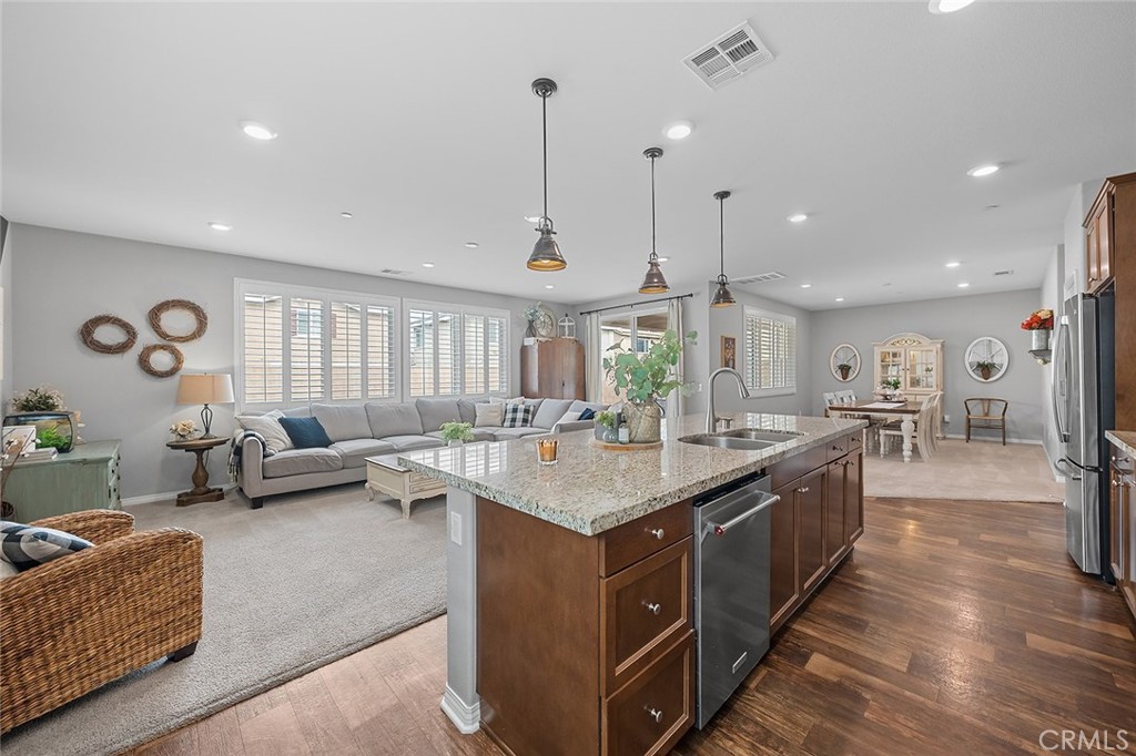 Welcome home to this beautifully maintained 4-bed, 3.5-bath residence in Fontana’s desirable Sultana Neighborhood. Built in 2016, this 2,628 sq ft two-story home offers an open-concept layout with hardwood-style flooring, recessed lighting, and plantation shutters throughout. The chef’s kitchen features granite countertops, a large island with bar seating, double oven, stainless steel appliances, and a walk-in pantry, all open to the spacious family room. A main-floor bedroom and full bath provide ideal guest or multi-gen accommodations. Upstairs, you’ll find a generous loft, a primary suite with soaking tub, separate shower, and dual vanities, plus two additional bedrooms sharing a dual-sink bath. The covered back patio overlooks a private yard, perfect for entertaining. Solar panels installed. HOA amenities include pool, kids’ pool, playground, clubhouse, and BBQ areas. 2-car attached garage. This home offers the perfect combination of space, style, and family-friendly living in one of Fontana’s most welcoming communities.