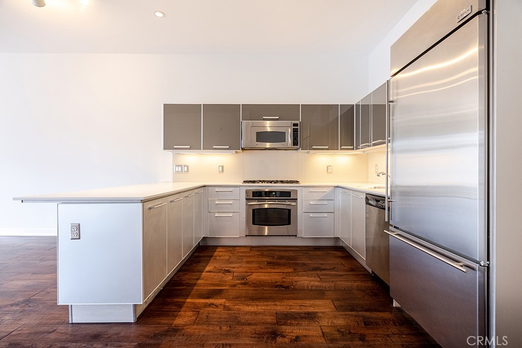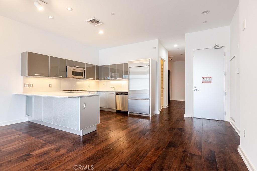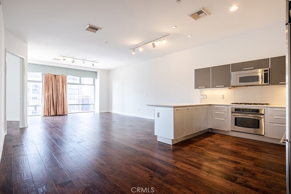 Wow. this comtemporary style Sky Lofts 2bed+ 2 full ba boasts the amazing amenities such as panoramic city view, bright and light open floor plan with upgraded hardwood floor, highly updated kitchen with built-in stainless steel refrigerator, dishwasher, microwave, gas cooktop, walk-in closet, laundry room, and two car garage spaces. Do not miss the community amenities of 24/7 gaurd security, recreation center, theater room, gym and much more! Entertain the LA Downtown life close to many restaurants, Whole Foods, CVS, shopping centers, LA Metro Station, LA Live and Staples Center! Water, trash, sewer & gas utilities are included.