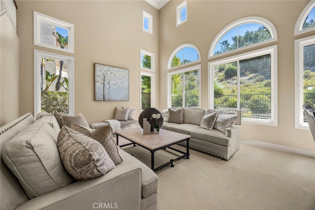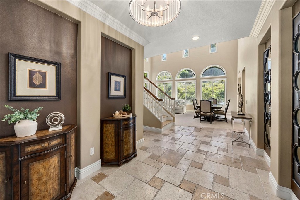 This impressive five-bedroom residence blends elegance with comfort, offering rich details and thoughtfully designed spaces throughout. Step inside to find soaring two-story ceilings in the formal living and dining rooms, tumbled travertine flooring, and walls of windows that bathe the interiors in natural light. The chef-inspired granite kitchen is the heart of the home, featuring a large center island, a full suite of stainless-steel appliances including a six-burner gas range, convenient meal planning desk, and abundant storage. The inviting family room is finished with a warming fireplace, and windows accented by plantation shutters. The main level also offers a versatile bedroom, currently outfitted as an office with handsome hardwood flooring, and built-in desk. A full bath and spacious laundry room complete the lower level. Upstairs, an expansive catwalk accented by art niches leads you to the primary sleeping quarters, Designed as a true retreat, this private space features light wood flooring and an expansive wall of windows. The en-suite bath boasts dual vanities, a separate make-up station, walk-in closet, walk-in shower and a sumptuous soaking tub as the centerpiece of the luxurious bath arena. Three additional bedrooms and a full bath complete the upstairs, including one bedroom with its own private bath. The outdoor spaces are just as inviting, with a paver-accented patio and built-in BBQ, a sun-drenched lounging area to enjoy, lush grassy lawns surrounded by colorful planters that create a serene setting. With no rear neighbors, this backyard sanctuary offers enhanced privacy. Additional highlights include a three-car garage and a location that balances style, comfort, and tranquility.