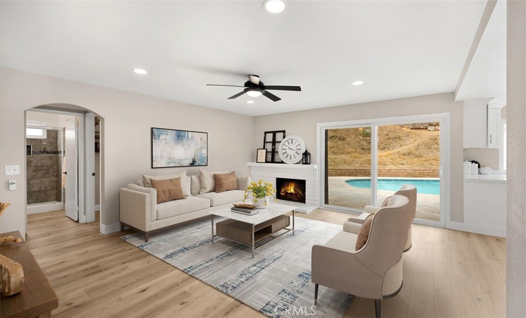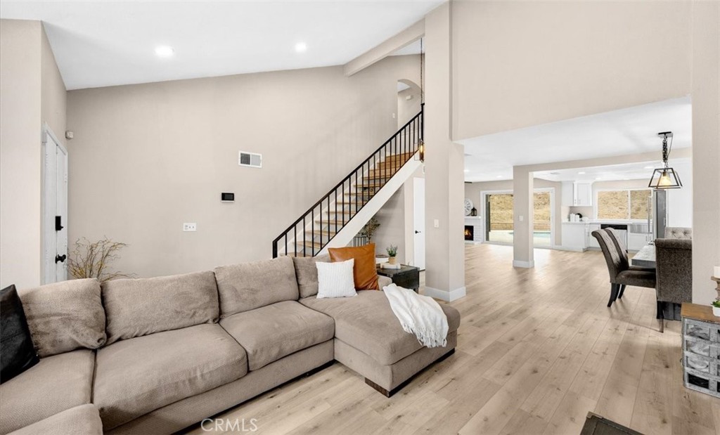 Elegant Turn-Key Home in the Hills of Jurupa Valley Welcome to this stunning fully remodeled home nestled in the scenic hills of Jurupa Valley, located right on the desirable Indian Hills Golf Club. This 4 bedroom, 3 bathroom home offers 2,095 square feet of modern living space with an open and airy floor plan, perfect for both everyday living and entertaining. Step inside to a grand entryway with vaulted ceilings that flow through the dining room and into the spacious kitchen. Enjoy brand new flooring throughout and an abundance of natural light from large windows overlooking the backyard. The show stopping chef’s kitchen features white cabinetry, a stainless-steel farmhouse sink, and a seamless connection to the family room. Cozy up by the white brick fireplace or open the sliding glass doors to the backyard oasis. The outdoor space is a true retreat, complete with a sparkling pool, shade pergola, large side yard, and plenty of room for entertaining family and friends. Downstairs includes a comfortable bedroom with corner windows and a stylishly updated bathroom with a tiled shower and sliding glass doors. The modern staircase with sleek metal railings leads to the upper level, where you’ll find an oversized primary suite featuring double door entry, vaulted ceilings, and a luxurious en-suite bathroom. The primary bath offers dual sinks, an arched entryway, and a large walk-in closet with barn doors. Truly a dream! Upstairs also includes two additional bedrooms, a full hallway bathroom, and a generous linen closet. Beautiful white wainscoting and freshly painted walls add a refined touch and character throughout upstairs. Additional highlights include a three-car garage, large side yard, low tax rate, move in ready, and no HOA. Conveniently located near top-rated schools, shopping, Golf course, and major freeways. This home truly has it all blending modern sophistication with timeless design in one of Jurupa Valley’s most desirable neighborhoods.