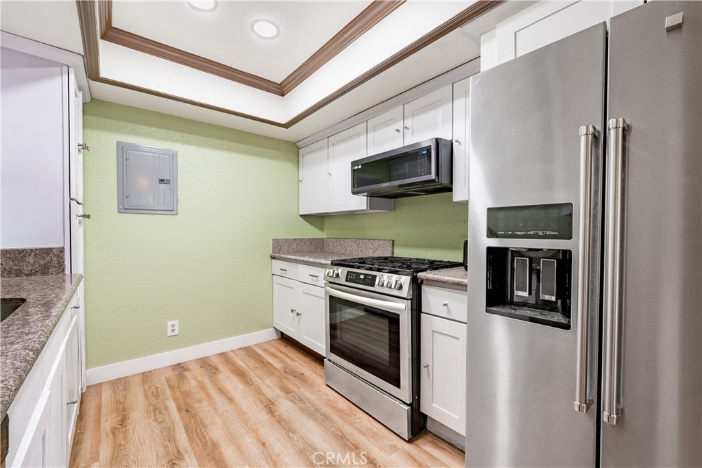 This beautifully updated home is designed for comfort and move-in readiness, featuring new energy-efficient upgrades in the likes of recessed LED lighting, a tuned up HVAC system, and newer tankless water heater. With 1,526 living square feet you have 3 bedrooms and 1 BONUS ROOM as well as 2 bathrooms to beautifully grew and enjoy the space. The main level welcomes you with a warm living room highlighted by a cozy fireplace—an ideal spot to relax after a long day. The remodeled kitchen shines with granite countertops, newer stainless steel range and microwave, and a charming dining nook, all conveniently located at the ground level with a mini front patio perfect for potted plants and chairs. The upgraded bathrooms include modern finishes such as a walk-in shower tiled shower and granite countertop for a spa-like experience. Your versatile primary bedroom includes a remodeled bathroom, walk-in closet, and centerpiece cozy electric fireplace. Every bedroom has their own floor – perfect for privacy! Additional upgrades includes a permitted brand new electrical and sub-panel in the kitchen for the entire unit. The attached 1-car garage provides ample space and storage while an additional detached 1-car garage adds even more parking and storage options. This small, peaceful community of just 30 residences also offers access to a refreshing association pool, combining comfort and relaxation. Located in Southwest Anaheim, the home sits close to Disneyland, the Anaheim Convention Center, Knott’s Berry Farm, and quick access to the 91 and 22 freeways. You will be proud to call this home! HOA HAS NO RENTAL RESTRICTIONS OR CAP.