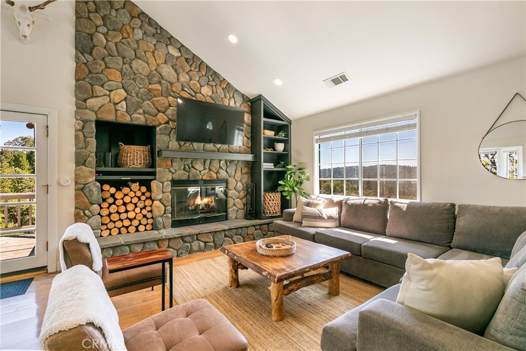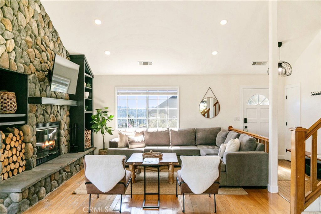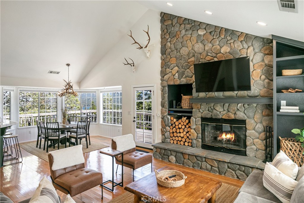 Welcome to Mountain Vista Retreat, where spectacular panoramic lake and mountain views are the star of the show. Situated in the serene hills of Lake Arrowhead, this beautiful and meticulously renovated 4-bedroom, multi-level home offers unparalleled vistas from nearly every room, creating a serene backdrop for daily living or a memorable retreat. The home’s expansive wraparound deck invites you to savor your morning coffee as the sun rises over the shimmering lake or gather with friends and family beneath the stars, taking in breathtaking sunsets and the fresh mountain air. This outdoor space seamlessly blends indoor-outdoor living, ideal for both relaxation and entertaining. Inside, you’ll find a thoughtfully crafted interior featuring stylish, contemporary finishes, high ceilings, and large windows designed to capture natural light and maximize the stunning views. A cozy fireplace anchors the spacious living area, creating a warm and inviting atmosphere perfect for gathering on cooler evenings. The gourmet kitchen is fully upgraded with modern appliances, ample cabinetry, and beautiful countertops, making it a joy for any culinary enthusiast. Adjacent dining spaces provide intimate settings for family meals or entertaining guests, all while enjoying captivating lake views. The home features four comfortable bedrooms, offering privacy and relaxation for family and guests alike. The master suite is a true sanctuary, complete with its own stunning views, creating an ideal retreat at day’s end. Additional bathrooms are tastefully updated with premium fixtures and finishes. Located at the end of a quiet, private road, the property ensures privacy and tranquility, yet it remains conveniently close to Lake Arrowhead Village with its charming shops, restaurants, and recreational opportunities. With full lake rights included, this home provides access to all the amenities that make Lake Arrowhead a highly sought-after destination. Perfect as a primary residence, a vacation getaway, or a profitable short-term rental investment, this property is a rare find. Don’t miss the chance to own a piece of Lake Arrowhead paradise, where everyday living feels like a vacation.