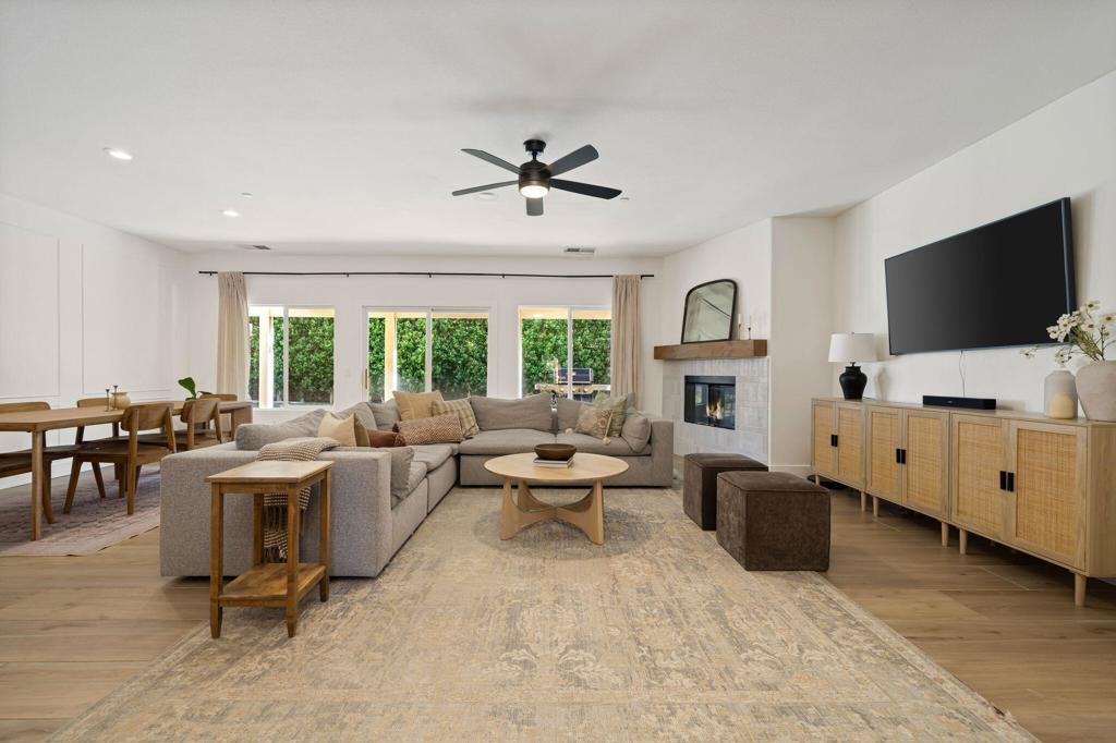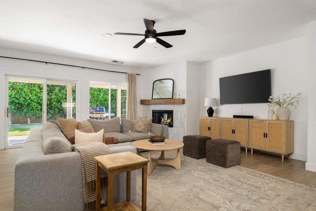 DON’T WAIT ON THIS ONE!!! What makes this home a STANDOUT PROPERTY in the coveted Mountain Gate community? Contemporary and thoughtful upgrades throughout… distinction & unmatched style… stunning ‘up close and personal’ mountain views… (not to mention MOTIVATED SELLERS!) are just a few good reasons not to delay touring this special listing. Many of the custom features and upgrades you’ll appreciate include new wood-look ceramic tile flooring in the living area, fresh paint and texture throughout, and upgraded recessed lighting and light fixtures. Baseboards and board & batten add dimension and charm. The supersized kitchen features quartz countertops, stainless steel appliances, and a custom pantry door sure to impress.Additional enhancements include Toto toilets, a newly installed Culligan water softener system and a Tesla charging station in the spacious 3 CAR GARAGE. Located on a generous pool-sized lot, the South facing backyard features an alumawood covered patio, mature verdant landscaping (including heavily producing citrus trees), stunning views of the San Jacinto mountains, and RV parking with plenty of room for dogs or gardening. Leased solar (fully transferable to the new owner) is responsible for HUGELY reduced electric bills throughout the entire year. Shockingly low HOA fees make this community one of the most sought-after in Palm Springs… not to mention just a 5 minute bike ride to downtown…which is known for it’s vibrant arts and culinary scene. There is a warm sense of community in Mountain Gate, hosting regularly planned events throughout the year which fosters a dynamic and connected neighborhood. Residents enjoy 3 community pools/spas, tennis and basketball courts, large playground, and expansive greenbelts. Impeccably maintained and artfully designed, this remarkable residence is a RARE FIND!! The sellers have loved living here and it shows. Make an appointment to view it today!